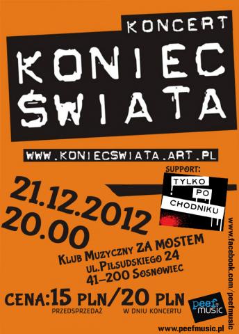 Już 21.12.2012 r. jak przepowiedzieli Majowie odbędzie się Koniec Świata!!! W związku z tym, Klub Muzyczny ZA MOSTEM przygotował dla Was koncert zespołu Koniec Świata! Chłopaki będą promować swoją nową płytę wydaną 19 października 2012 r. pt. Hotel Polonia Jako support zagra zespół Tylko po chodniku!